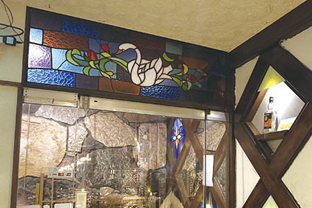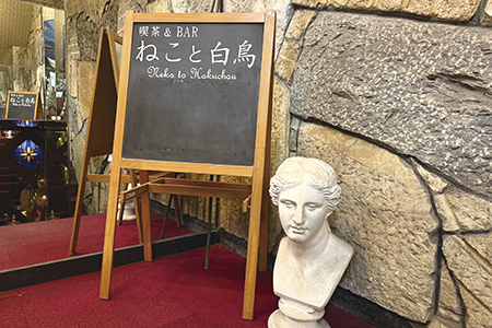 旧マルサン書店の十字路を50メートルほど南に進んだ右手に『ねこと白鳥』はあった。建物に看板はない。オープン時間の17時になると立て看板が出され、初めてその場所がわかるのだ。建物に入り地下へ続く階段の踊り場に置かれた石膏の置物が、昔でいう『純喫茶』の様相を呈している。壁には鏡とステンドガラスが施され、映し出された自分の姿に一瞬驚きを覚える。さらに階段を降り、いざ店内へ。